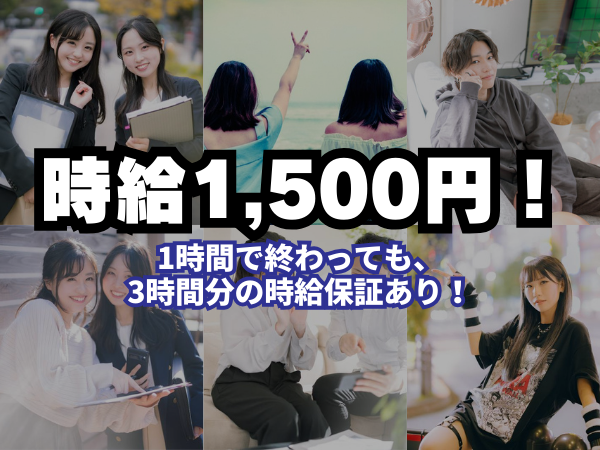| 給与 | 時給:1,500円 〜 ■1時間で終わっても3時間分の時給保証あり →1時間で終われば1500円×3時間分=4500円を支給! ■日払い・週払いOK(規定あり) ■稼働分給料前払いOK ■即日払いOK(規定あり) ■現金払いOK ■昇給あり ■昇格あり |